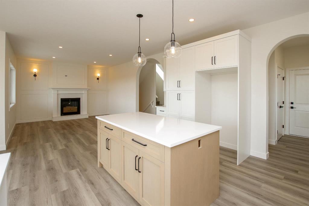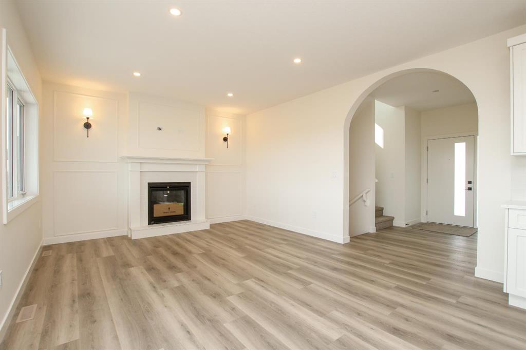BRAND NEW 3 BEDROOM, 3 BATHROOM 2-STOREY ~ STYLISH FINISHES & LOADED WITH UPGRADES THROUGHOUT ~ OVERSIZED DOUBLE ATTACHED GARAGE ~ IMMEDIATE POSSESSION AVAILABLE ~ 12' x 11'6" covered front veranda welcomes you and leads to a bright and spacious foyer ~ Archway leads to the warm and inviting living room with high ceilings, large windows that fill the space with natural light and a cozy fireplace with a raised hearth, mantle, and feature wall with decorative moulding and lighted wall sconces ~ The stunning k...