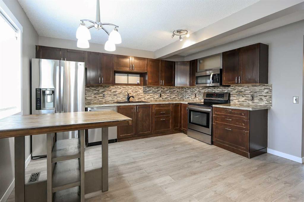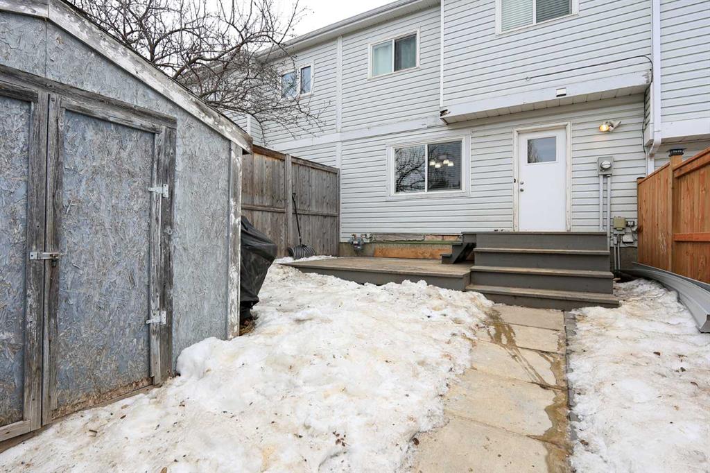 IMMEDIATE POSSESSION & MOVE IN READY ~ 4 BEDROOM, 3 BATHROOM 2-STOREY TOWNHOME ~ NO CONDO FEES ~ The living room features south facing windows and a cozy gas fireplace with a brick surround and raised hearth ~ The eat-in kitchen offers plenty of dark stained cabinets, ample counter space, full tile backsplash, granite composite sink and tons of space for a dining table and chairs ~ 2 piece bath is located next to the main floor laundry and rear entry with access to the deck and backyard ~ The primary bedroo...