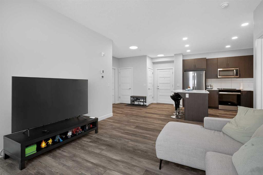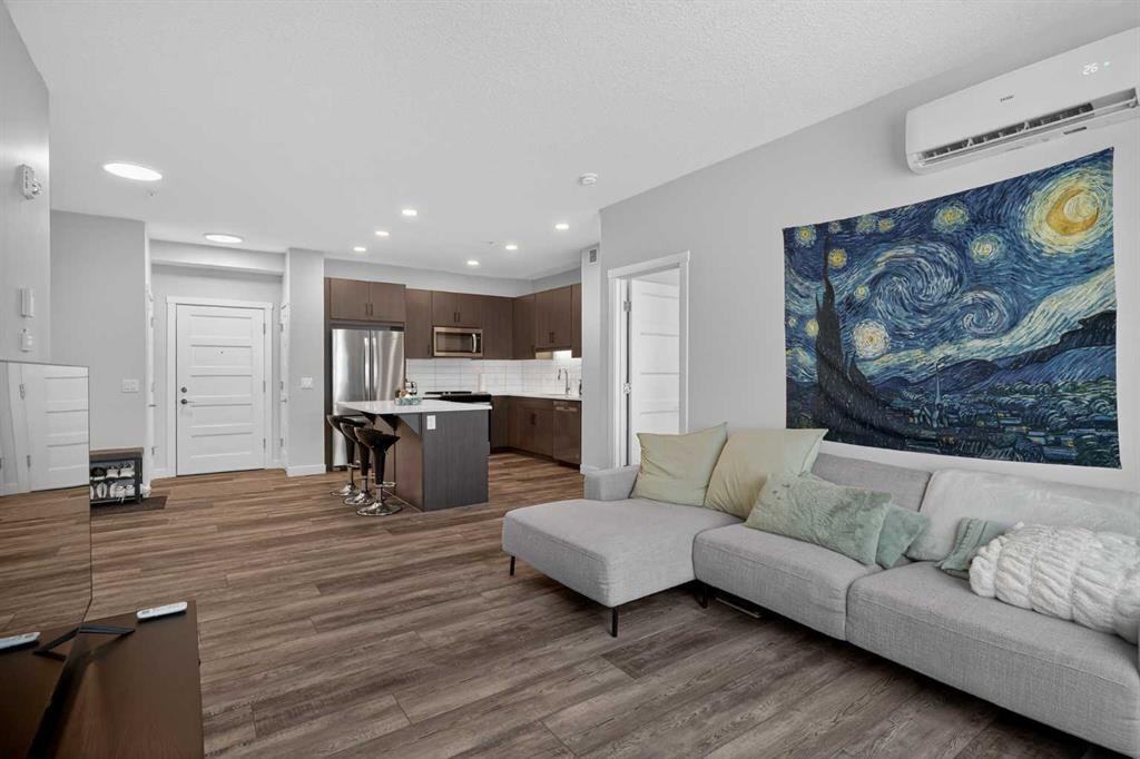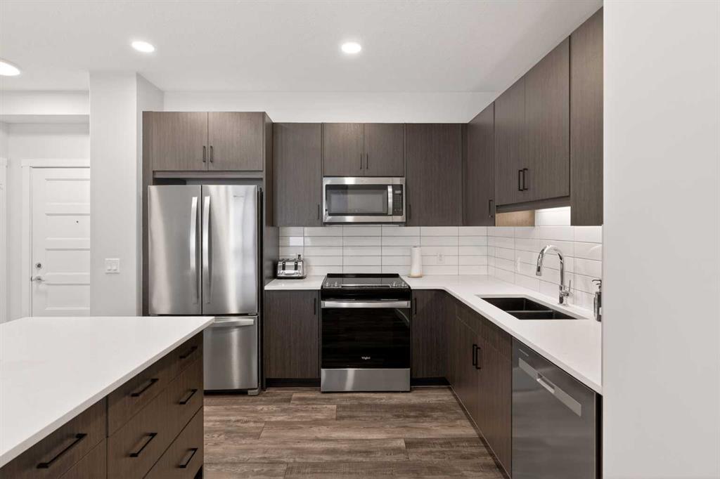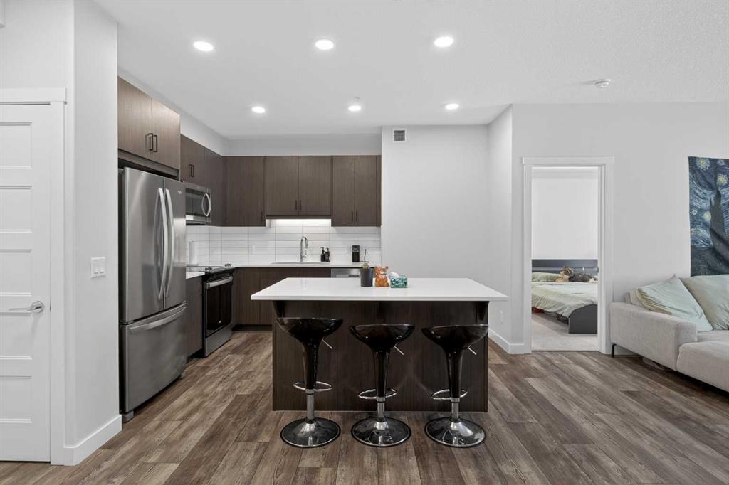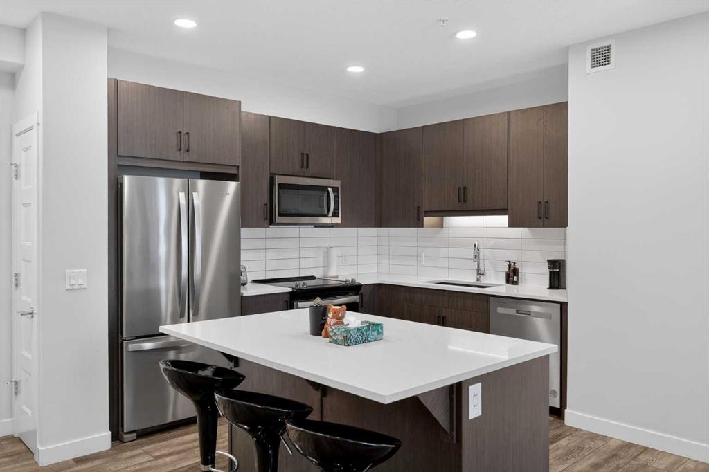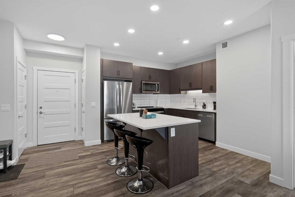 Experience elevated modern living in this exceptional third-floor condominium, perfectly situated in the vibrant new community of Wolf Willow. This home has been meticulously curated with premium upgrades, including soaring ten-foot ceilings and durable luxury vinyl plank flooring, creating a sophisticated environment that seamlessly blends high-end style with everyday convenience. The heart of the home is a chef-inspired kitchen designed for both functionality and aesthetic appeal, featuring elegant quart...